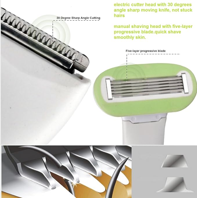 - 2 in 1 pubic hair trimmer :Intimate part hair is diffcult to shave, because the skin is complex, easy to hurt the skin.This 2 in 1 pubic hair trimmer is good chocie for pubic hair.fistly,trimmed short by electric cutter head.then use manual razor get smooth skin.it is good for pussy,viginal detail trimmer.One head features an electric thinning trimmer to quickly and painlessly shorten and thin out thick hair. The other head is a manual safety razor to shave the stubble for a perfectly smooth, close finish. This versatile design meets all your grooming needs in a single device.