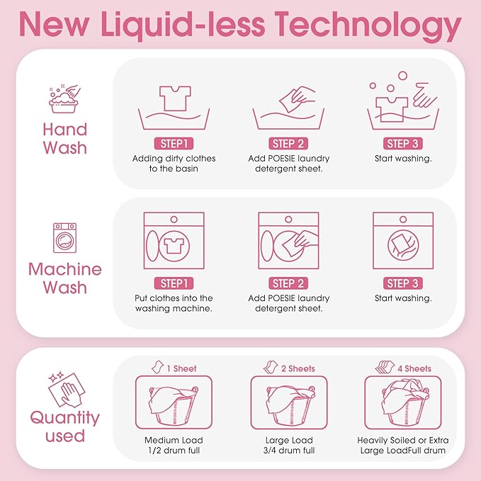 - Easy to Use - Liquidless detergent sheets, 1 sheet for small or medium loads where clothes are not very dirty, 2 sheets for large loads and 4 sheets for extra large loads, no waste. Not too little and not too much to save resources