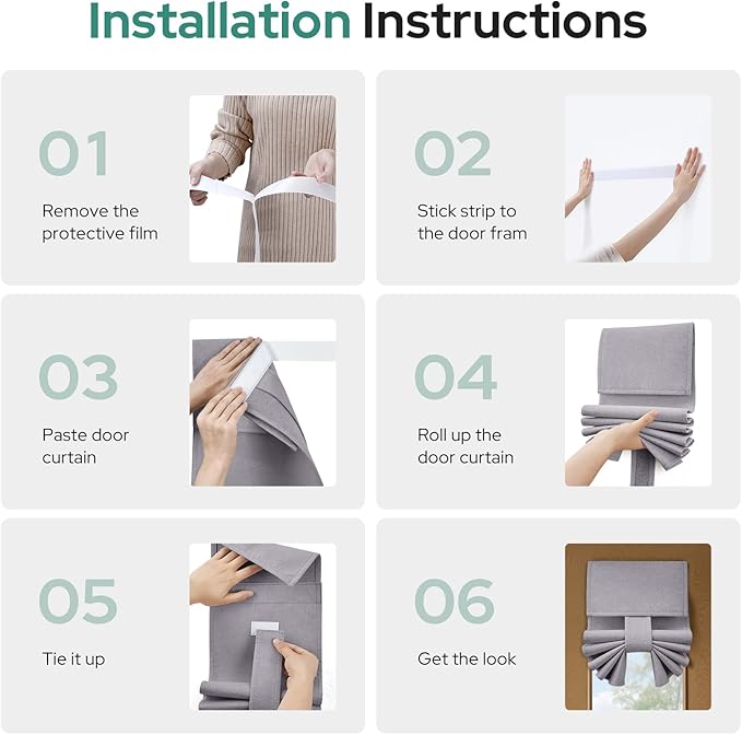 - 🌸EASY HANGING: The package includes 1 door curtain panel and 1 adhesive strip. It can be easily installed without any tools or curtain rods. Just follow our instructions picture to install, put the sticky strip on the glass, and join together with the sticking place on the door curtain panels firmly.