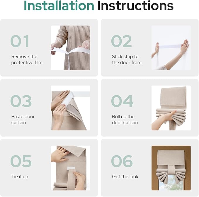 - 🌸EASY HANGING: The package includes 1 door curtain panel and 1 adhesive strip. It can be easily installed without any tools or curtain rods. Just follow our instructions picture to install, put the sticky strip on the glass, and join together with the sticking place on the door curtain panels firmly.