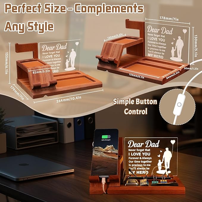 - Illuminate Dad's Nightstand: The creative solid wood docking station not only organizes your desktop in an orderly manner but also serves as a night light decoration, creating a warm atmosphere in your room. The light is soft and not dazzling, the highly used multi-functional organizer is also a daily reminder of your love