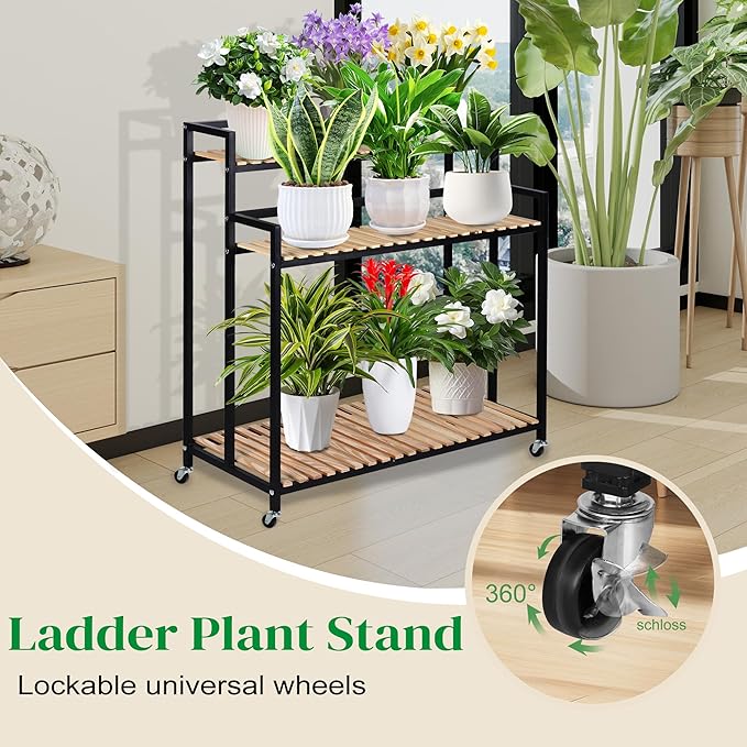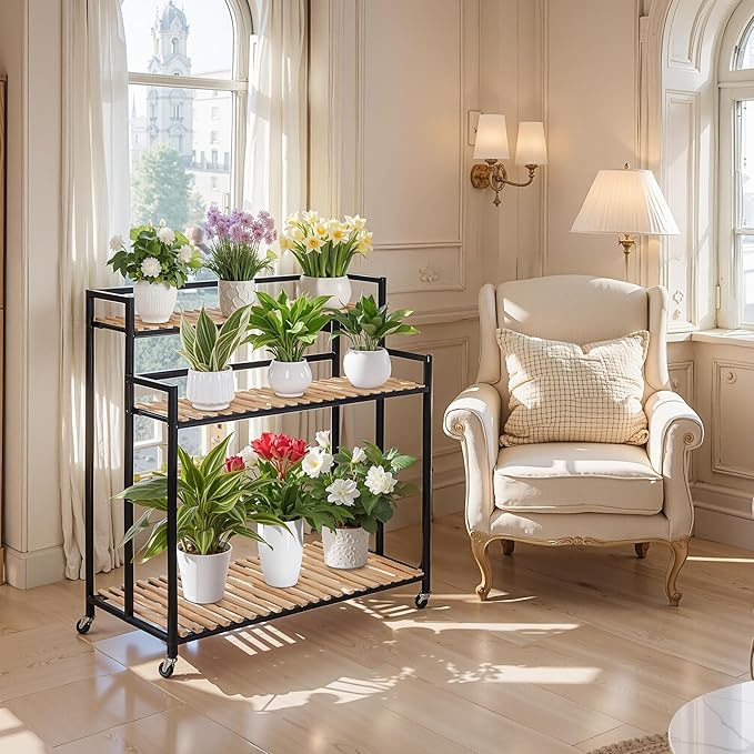 3-Tier Plant Shelf Modern Rolling Plant Stand with Rustic Wood and Iron Frame. for indoor/outdoor use in Living Spaces or Patio.Space spare,Robust Pine,Easy Assembly
