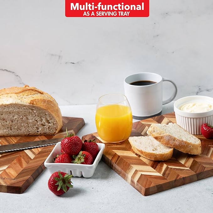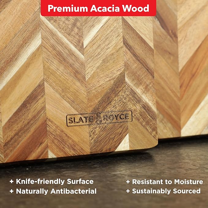 - SIGNATURE HERRINGBONE PATTERN -- Unique geometric V-design showcases premium acacia that's 90% harder than bamboo. Food-safe, chemical-free construction with self-healing grain that naturally resists stains.