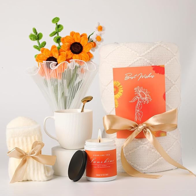 - π» Happy Birthday Gifts for Women - Our self care gifts for women are the perfect gift to impress and comfort a loved one who is sick or feeling down. (1)Snuggly Knitted Tassel Blanket (2)Fuzzy Socks (3)Ceramic Mug (4)A Bouquet of Sunflowers (5 pieces) (5)Metal Spoon (6)Soy Wax Lavender Candle (7) Sunflower Gift Card (8) A roll of ribbon (9)Gift Box