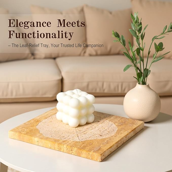 - SPIRITUAL AND NATURAL EMBOSSED TEXTURE: Erongoo Marble embossed tray is made of 100% natural golden travertine with a leaf texture carved into the surface, which is so vivid and natural that you can clearly feel the shape of the leaf veins when you run your hand over it. Each tray showcases a unique marble pattern, ensuring no two are alike. Adding a touch of natural elegance to your space.