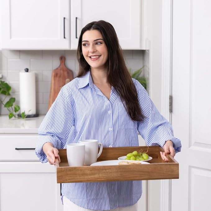 - Premium Acacia Wood Construction : Our wooden trays are made from durable and sustainable acacia wood, known for its strength, natural beauty and moisture resistance. This food tray has high weight bearing capacity and is safe for serving food and drinks, displaying decor items, or organizing essentials on your coffee table, ottoman, couch or bed. The included 3 vanity tray inserts can be used for serving or to hold candles, incense or bath products in the bathroom as a bathroom tray.
