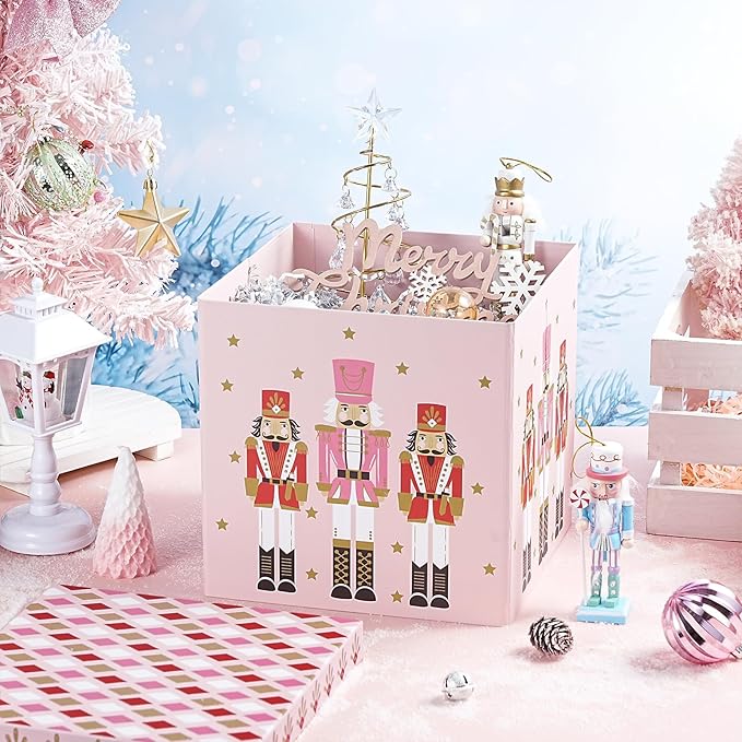 RUSPEPA Christmas Gift Box with Lid, Pink Nutcracker Soldier Design and Diamond Pattern Lid, Medium Collapsible Box with Ribbon, Tissue Paper for Girls, Gift Wrap, Candy Storage, 9x9x9 Inches, 1 Pcs