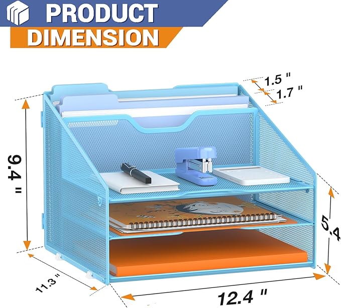 Letter Tray Organizer, Mesh Desk File Organizer with 3 Paper Trays and 2 Vertical Upright Section (Blue)