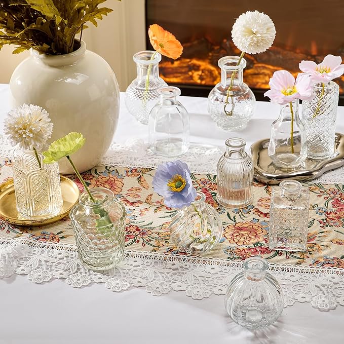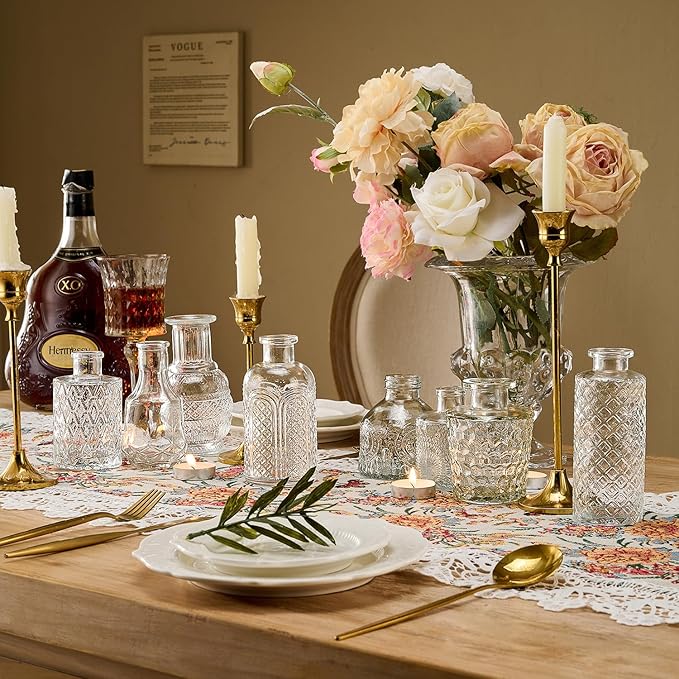 - Versatile Flower Bud Vase Set: This set comprises 24 diverse transparent glass flower bud vases, each adorned with etched designs to further elevate their charm. It is perfectly suited for any home décor. Whether placed as a centerpiece on dining tables, window sills, or wedding banquet tables, these small vintage crystal vases will lend an air of elegance to the setting.