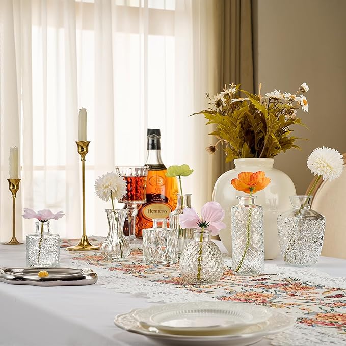 - Versatile Flower Bud Vase Set: This set comprises 36 diverse transparent glass flower bud vases, each adorned with etched designs to further elevate their charm. It is perfectly suited for any home décor. Whether placed as a centerpiece on dining tables, window sills, or wedding banquet tables, these small vintage crystal vases will lend an air of elegance to the setting.