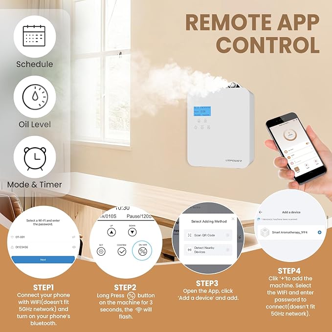 - Smart App + On-Device Control:Set custom schedules by day/time, mist intensity, and work/rest cycles (e.g., 10s on / 60s off). App (iOS/Android) and manual control let you fine-tune strength while optimizing oil consumption; typical mid setting ≈0.63 ml/h (8 h/day).