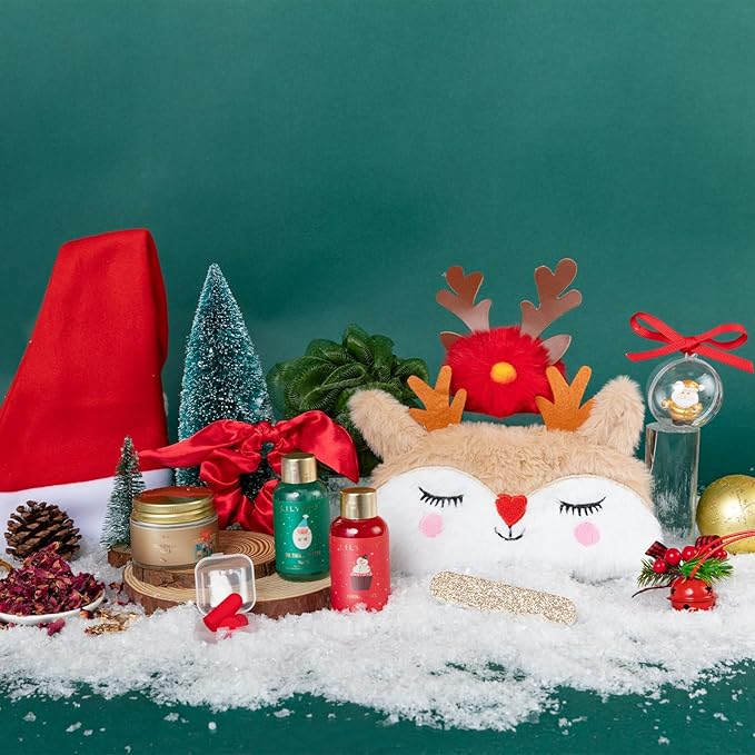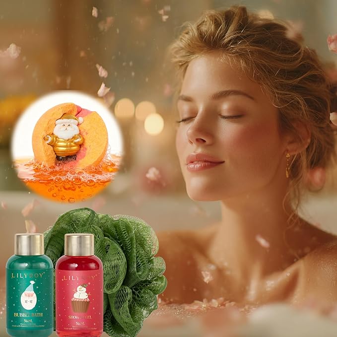 - 16Pcs Christmas Gifts for Women Mom: 50ml Shower Gel, 50ml Bubble Bath, 60g Christmas fizzer with Toy, 30g Soy Candle, Bath Sponge, 5g Dry Flower, Brown Brush, Red Earplugs, Keychain, Christmas Cap, Nail File, Brooch, Decorative Bell, Cute Sleeping Mask, Decorative Ball with Ribbon, Scrunchy with Bow packaged in a nice beautiful Paper Gift Box. The christmas spa gift sets for women offer the most luxurious and perfect bath experience
