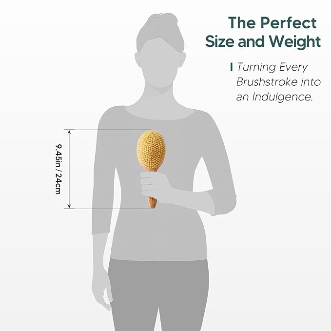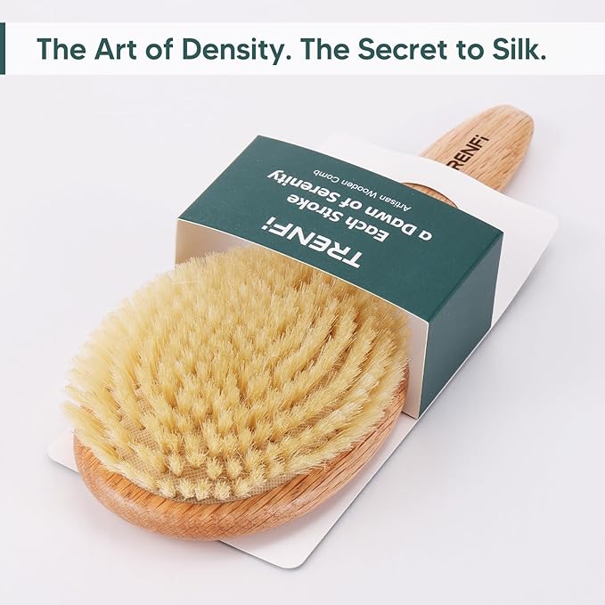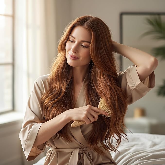 - NATURE’S OWN CONDITIONING TREATMENT – Featuring 100% First-Cut Boar Bristles (the stiffest, most structurally intact root section). These dense bristles effectively capture natural scalp oils (sebum) and redistribute them to dry ends. The result? Frizz is tamed, static is managed over time, and hair reveals a deep, living luster that synthetic sprays cannot replicate.