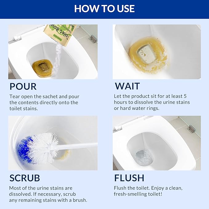 - EASY TO USE. After pouring the powder into the toilet, let it work for 5 hours. Scrub if needed, then flush away. It’s an effortless way to keep your toilet spotless.