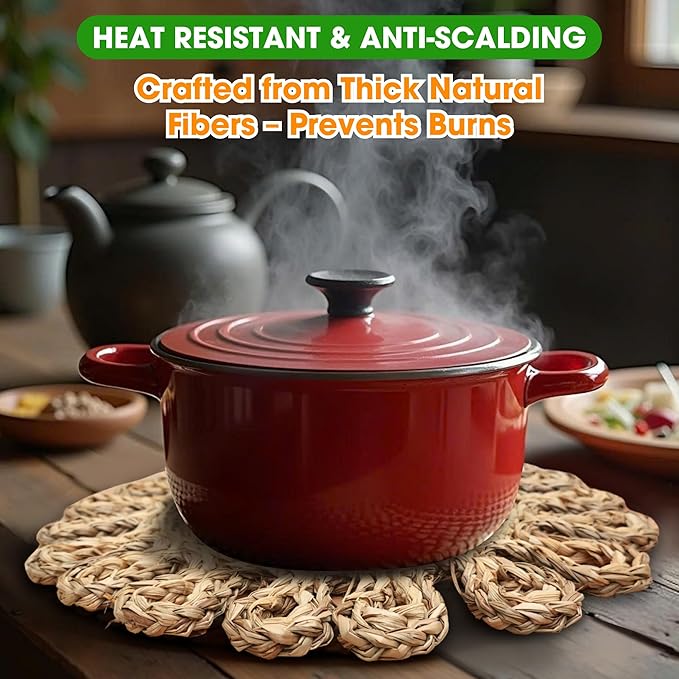 - π₯ HEAT RESISTANT & ANTI-SCALDING β Crafted from thick natural fibers, these heat resistant placemats protect your surfaces from burns and stains. Whether used as jute placemats, rattan chargers, or outdoor placemats, they provide peace of mind while adding effortless beauty to any dining experience, whether indoors or alfresco.