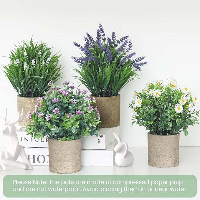 - Durable Material with Natural Style: Made of premium plastic, these small fake plants won’t wither or fade. Each piece is potted in a stylish gray paper pulp pot with a matte texture that brings a rustic farmhouse charm. Please Note: the pulp pots are not waterproof — avoid placing them in or near water
