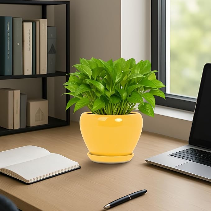 Deep Dream 6 Inch Plant Pots- Ceramic Planter Pot with Drainage Hole and Saucer, Round Flower Pot for Indoor Outdoor Succulent, Snake Plants and Cactus, Yellow