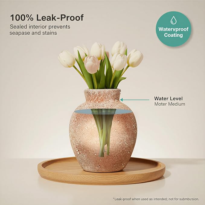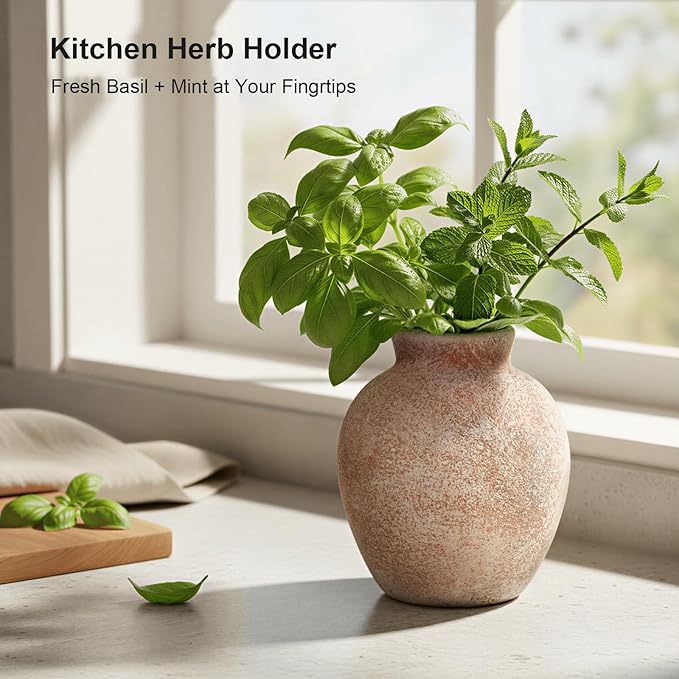 - [Perfect Size] The small vintage vase measures 6 inches tall and 5 inches wide, with a 2.4-inch opening. Each terracotta vase features a non-slip base that protects furniture and keeps it steady. It is ideal for tabletops, shelves, mantels, or as a charming centerpiece. Use alone or mix and match with other vases for a layered look.