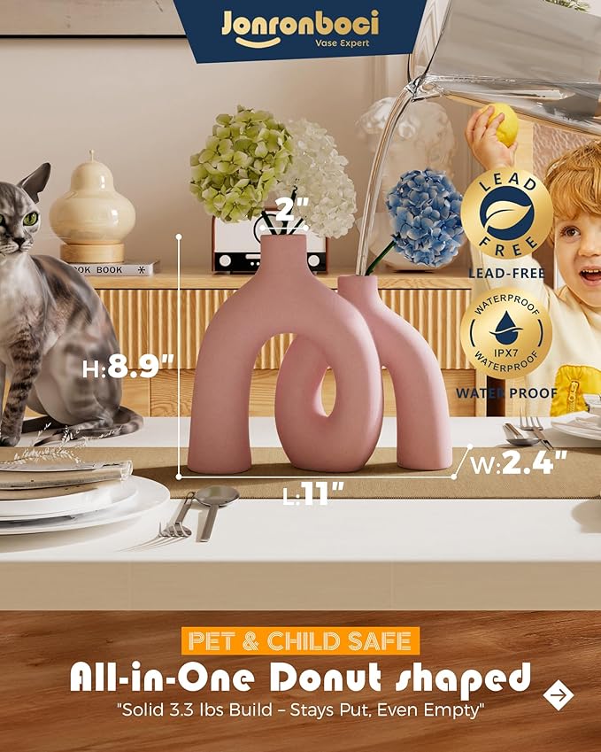 Hug Donut Decorative Vase Set - Light Pink Modern Glam Eclectic Style Vases Home Decor, Matte Ceramic Decorations for Living Room Shelf, Bookshelf Mantle Entryway Table or Console Décor(Pink)