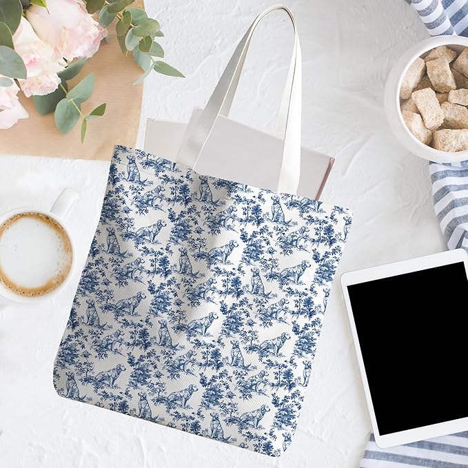 Blue Golden Retriever Tote Bag, Blue and White Chinoiserie Dog Canvas Tote Bags for Women, Grand Millennial Gifts for Women, Vintage Dog Reusable Grocery Shopping Bag