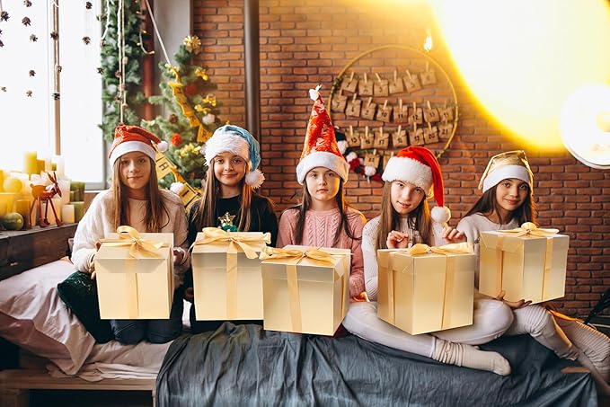 Jaywayang 5 Pack Gold Gift Boxes with Lids, Ribbons and Tissue Papers Square Gift Boxes - 7.1 Inch - Christmas Presents Wrapping Hanukkah Decoration Party Favor Boxes.