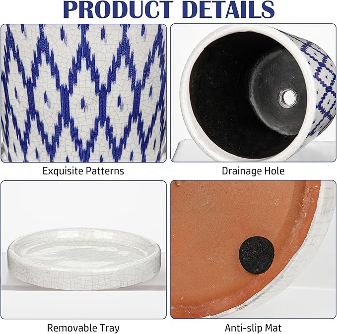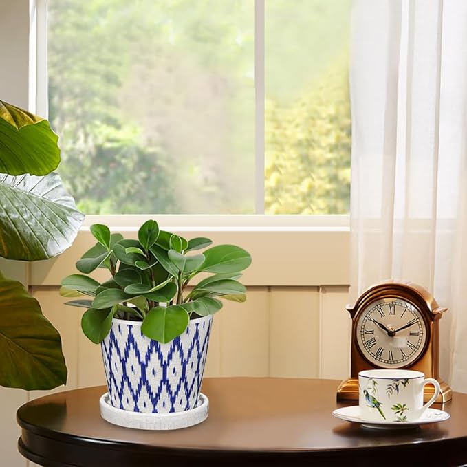 Plant Pots 5.5 Inch, Ceramic Planter with Drainage Hole and Saucer for Indoor Plants, Ice Crack Diamond Pattern Vintage Garden Pots for Succulent Orchid Snake Plants Flower (Blue)