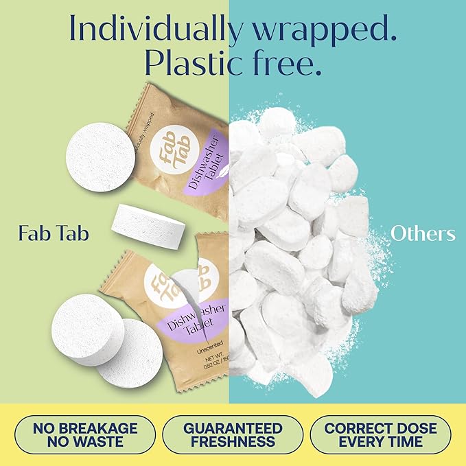 Fab Tab Dishwasher Tablets, Unscented, A Plastic Free Dishwasher Pod Alternative, Powers Through Grease, Leaves No Residue, Safe for The Whole Family, Individually Wrapped