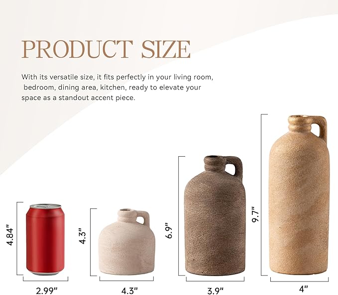 - 【Perfect Size】Large: 4.0"L × 9.7"H;Medium: 3.9"L × 6.9"H;Small: 4.3"L × 4.3"H. Featuring intricate detailing and a rich texture, this vase complements a variety of home styles—farmhouse, rustic, country, even modern. It effortlessly blends in with existing furniture and accessories, adding a timeless charm and harmonious look to your space.