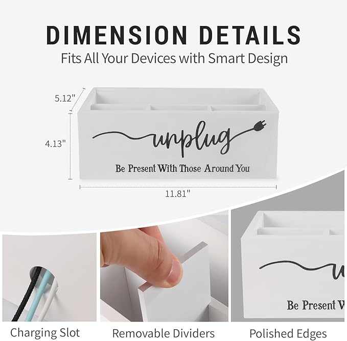 - 【Modern Farmhouse Style Phone Box】Each box is engraved with the "Unplug" design as shown. Unlike other phone organizers with sharp edges, Intarsio’s wooden phone box features rounded, handcrafted edges that ensure both safety and style.