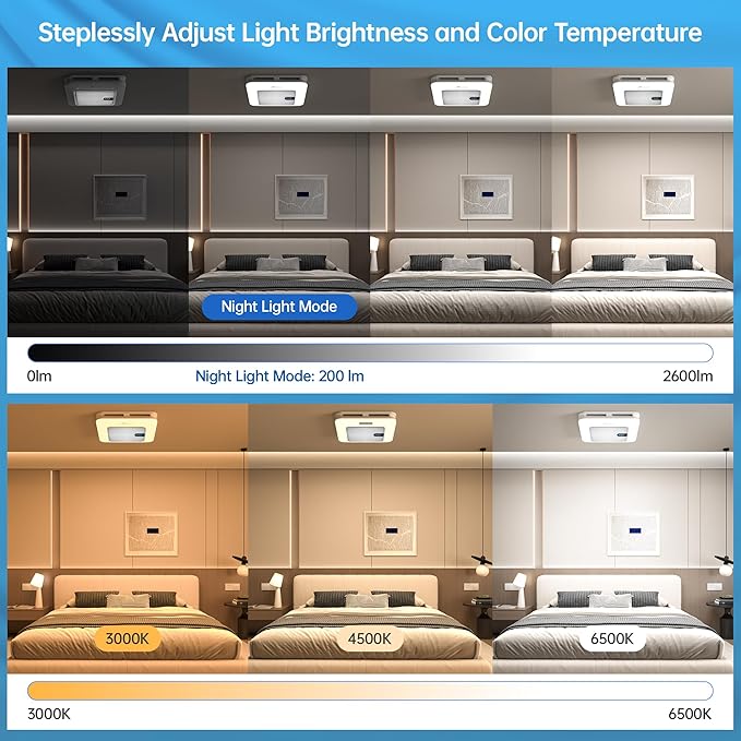 - Stepless Dimming & Nightlight: The HAWKROWN bathroom exhaust fan with light of stepless three color temperatures and nightlight. You can adjust 3000K, 4500K, or 6500K color temperatures and adjust brightness with stepless dimming based on your needs. It is also equipped with a 200lm nightlight that provides soft illumination to help navigate safely in the dark while creating a comfortable sleep environment