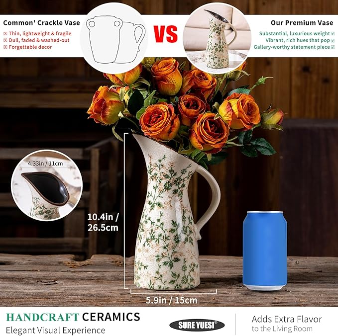 - 【Thoughtful Gift Idea】The SURE YUESI vintage pitcher vase makes a stylish gift for family and friends. Perfect for housewarmings, holidays, or special occasions, this decorative vase combines rustic elegance with practicality, making it a timeless piece for green vases home decor or cottage core decor.