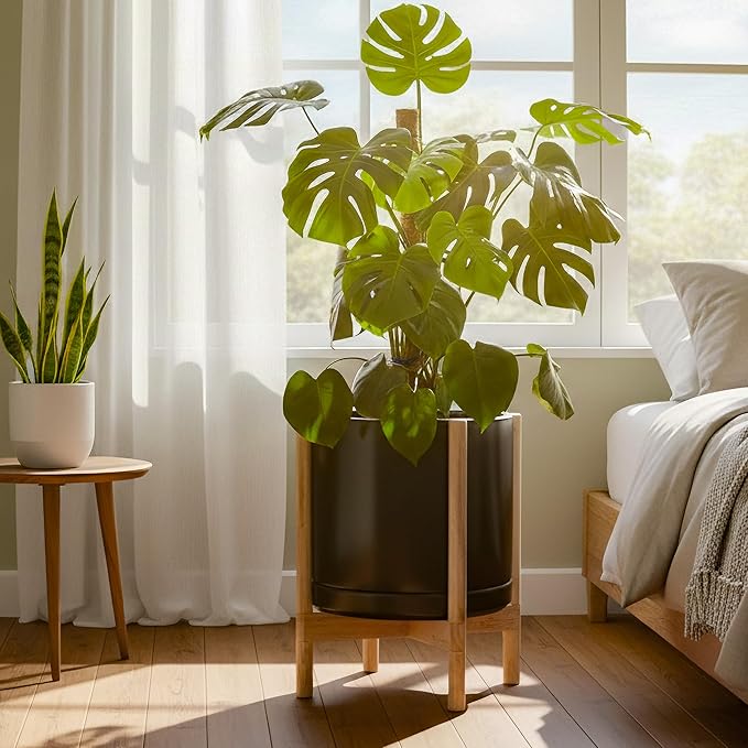 - A Complete Set: Mid-century ceramic planter, combined with a natural color, sculptural, solid wood stand that match perfectly together and looks great in anywhere.