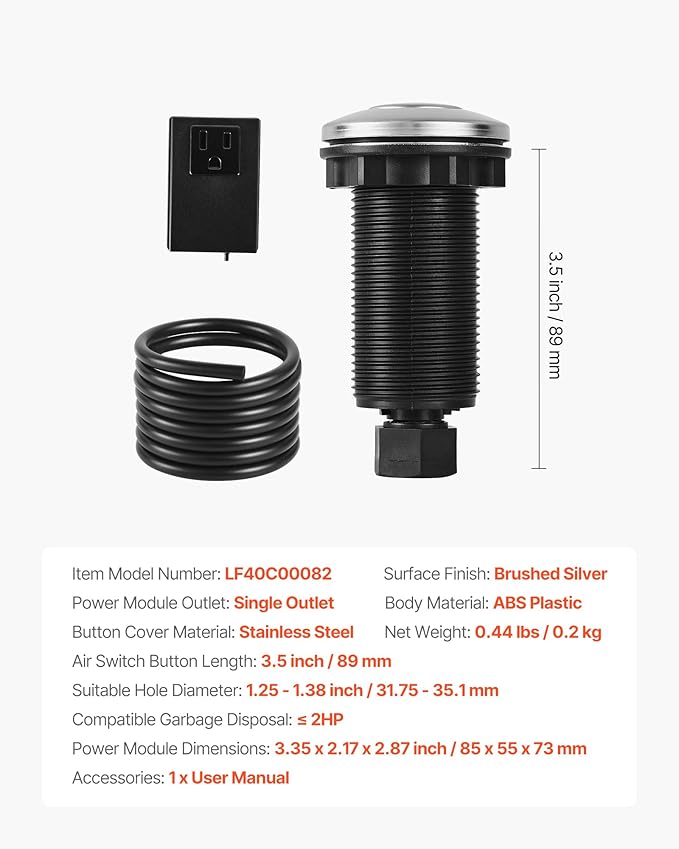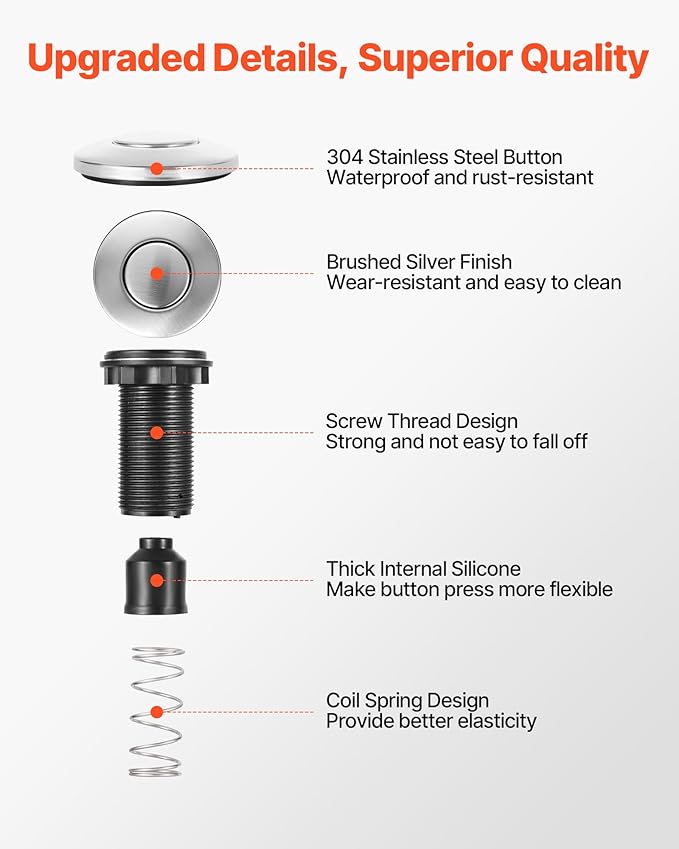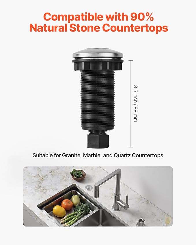 - Wide Compatibility: This VEVOR garbage disposal air switch kit fits standard sink hole diameters of 1.25–1.38 inch / 31.75–35.1 mm. The air switch button is 3.5 inch / 89 mm long, suitable for thick countertops like granite, marble, and quartz. Compatible with most garbage disposal brands (≤2HP)