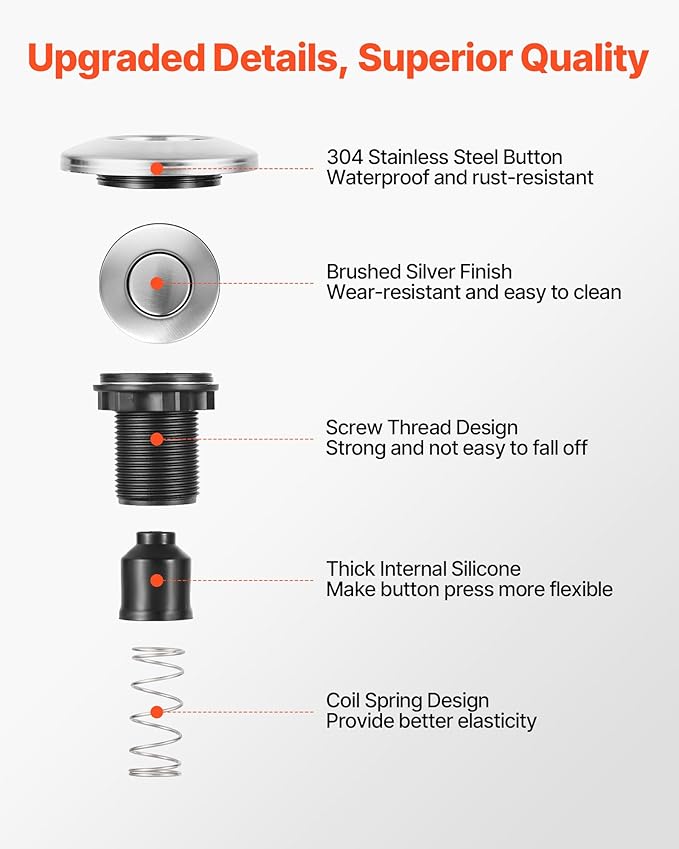 - Durable & Safe: The cover of the garbage disposal air switch button is made of waterproof stainless steel with a brushed silver finish, resistant to rust and wear. It’s responsive to press - gently press to turn on the garbage disposal, and press again to turn it off