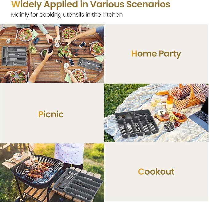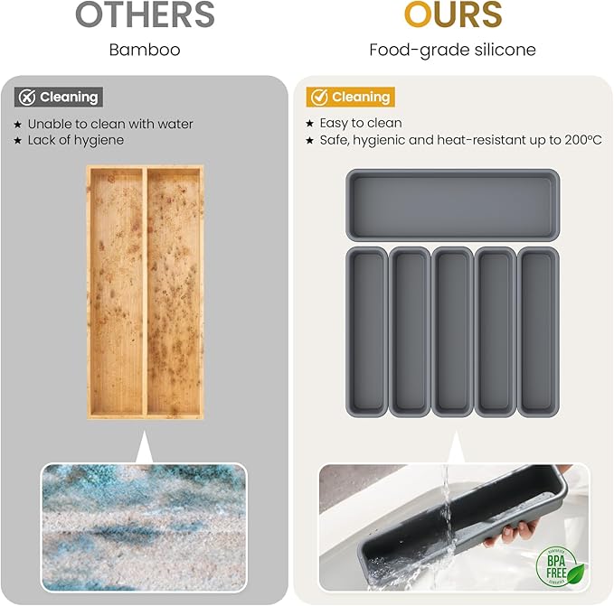 - Easy to Clean and Maintain: This kitchen drawer organizer silicone material is waterproof and stain-resistant. It can be directly put into the dishwasher for cleaning or hand-washed, which is convenient and fast, saving your cleaning time and making life easier