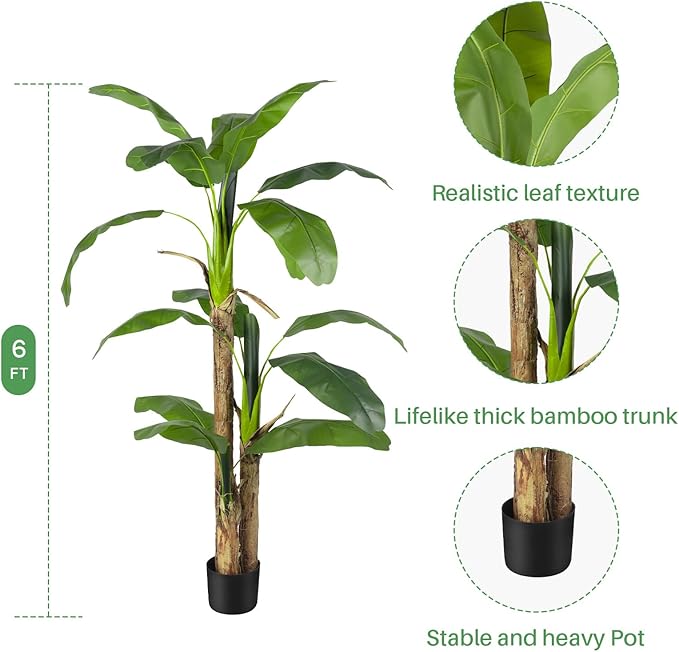 - 【PREMIUM QUALITY MATERIAL】This artificial banana tree faux tall plant is made of durable and premium polyester material, the base is made of solid cement which to prevent children, pets knock it down. So easypto keep clean, if them happen to get a little dusty, simply wipe with a damp cloth or duster.
