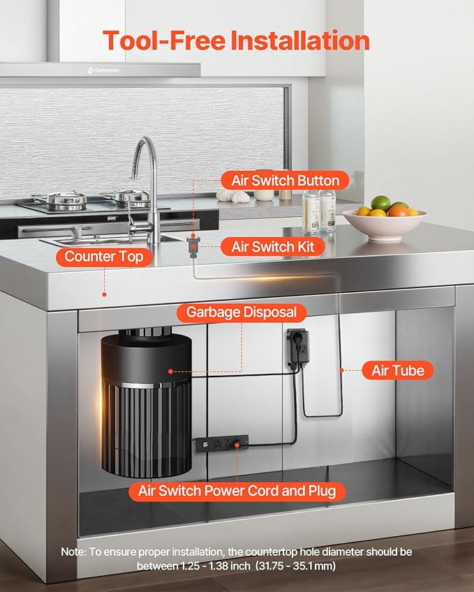 - Wide Compatibility: This VEVOR garbage disposal air switch kit fits standard sink hole diameters of 1.25–1.38 inch / 31.75–35.1 mm. The air switch button is 2.5 inch / 63.5 mm long, suitable for stainless steel sink countertops and compatible with most garbage disposal brands (≤2HP)