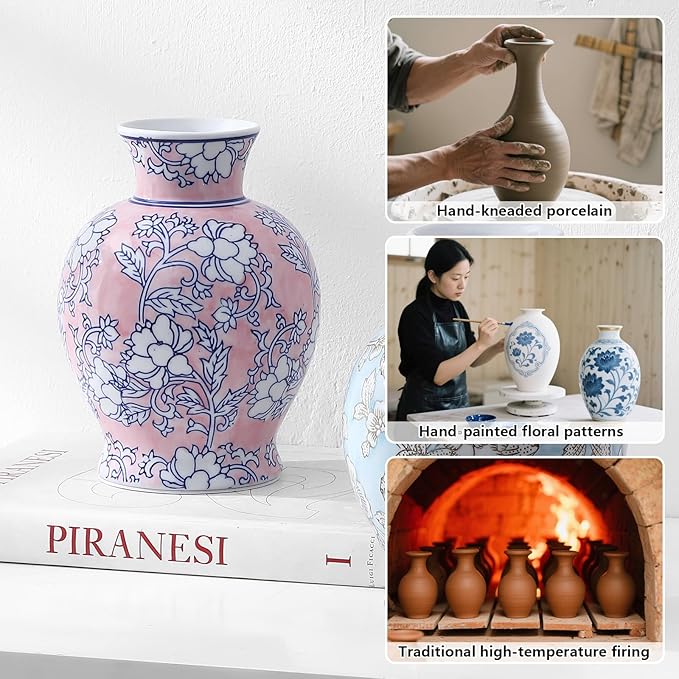 Vintage Chinoiserie Floral Ceramic Vase, Large Rustic Pottery Vases for Living Room, Entryway, Dining Table Centerpiece, Farmhouse Home Décor, Floor or Tabletop Flower Vase, (Pink)