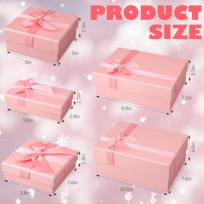 - 5 Sizes Gift Boxes: with 5 different sizes to choose from, these gift boxes with lids offer flexibility; The detailed sizes are the following: about 10.6 x 7.6 x 4.4 inches, 9.9 x 7.1 x 3.3 inches, 5 x 5 x 2.3 inches, 5.9 x 2.9 x 1.7 inches and 3.6 x 3.6 x 1.3 inches; You can use them for gifts of different shapes and sizes, from jewelry to clothing to small electronics
