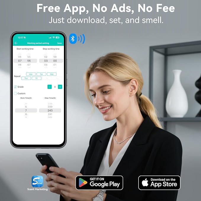 - Quick Setup Guide: Connect in Minutes.1.Download the ‘Scent Marketing’ app from the Apple App Store or Google Play Store.2.Power on your diffuser.3.Open the app, select “Bluetooth” in the settings, and choose your device from the list.4.Enter the passcode “8888” when prompted.5.Once connected, customize your mist schedule, intensity, or auto-start times in the app.6.Don’t forget to tap “Save” in the top-right corner to lock in your settings—done!