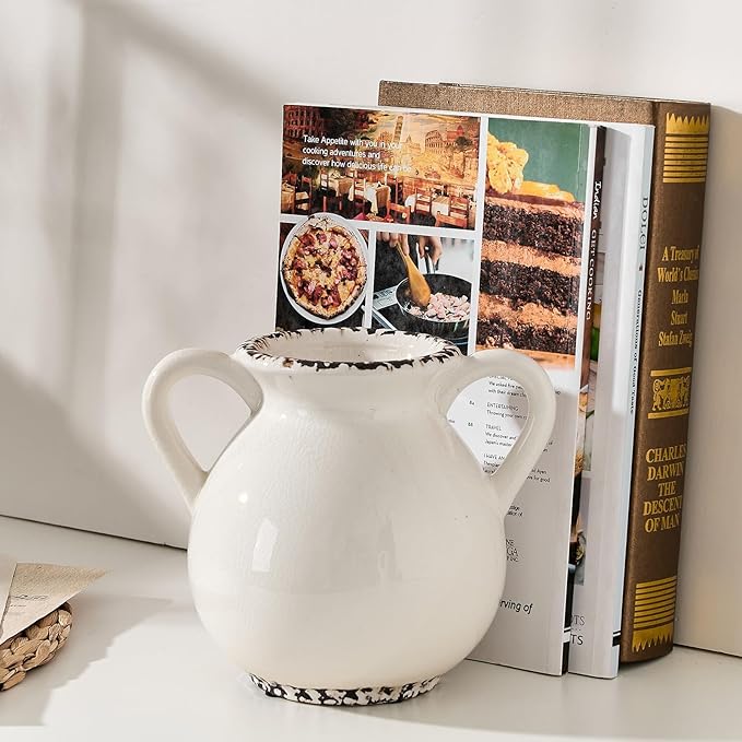 LUKA Antique Ceramic Vase with 2 Handle,6.4 inches Ice Cracked Rustic Vase Minimalist Decor, Decorative Vases for Home Decor, Table, Living Room, Shelf, Christmas Decoration(Small,Ice Cracked White)