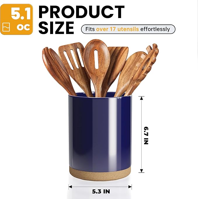 Ceramic Kitchen Utensil Holder for Countertop, Modern Crock with Non-Slip Cork Base, Counter Organizer for Cooking Tools , Blue