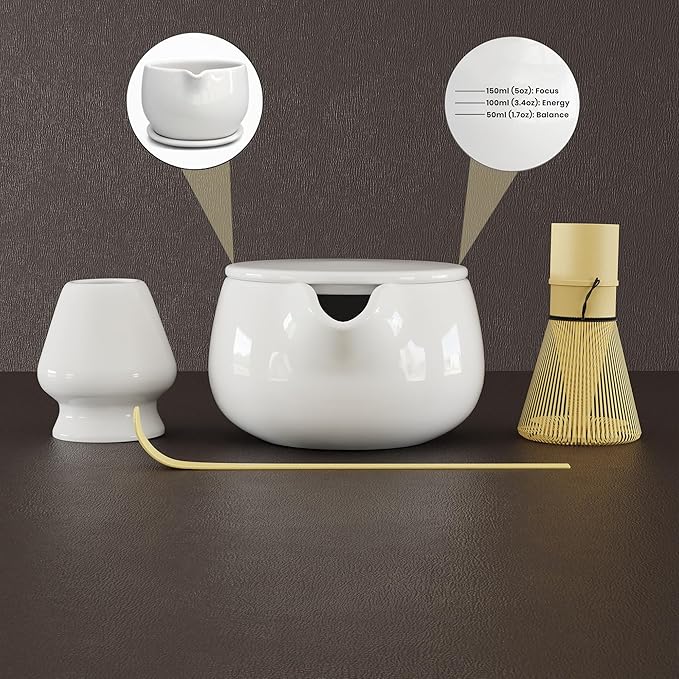 - COMPLETE MATCHA SET / MATCHA KIT: Create an authentic matcha experience at home with this full matcha whisk set, including a 650ml matcha bowl set with 150ml (Focus), 250ml (Balance), and 350ml (Calm) measurement lines. Comes with a handcrafted bamboo chasen whisk, bamboo scoop, whisk holder, and multifunctional lid/coaster. Perfect as a matcha starter kit or matcha making kit.