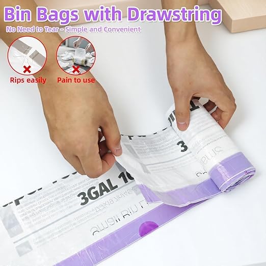 - Strong Drawstring Closure for Easy Disposal:Each 3 gallon trash bag with drawstring features reinforced handles, making it effortless to lift, tie, and carry. Say goodbye to messy spills and enjoy cleaner, more hygienic waste management.