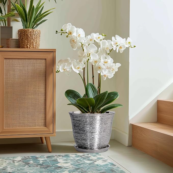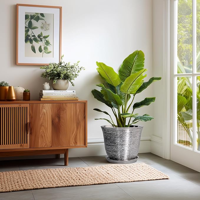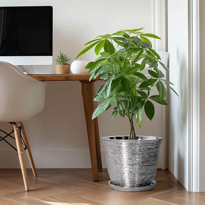 Ceramic Planter - 12 Inch Pots for Plants Indoor Outdoor, Round Planter with Drainage Hole and Saucer, Modern Decorative Planters, Large Plant Pot, House Patio Decor, Garden Gifts, Silver
