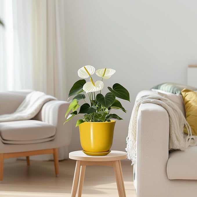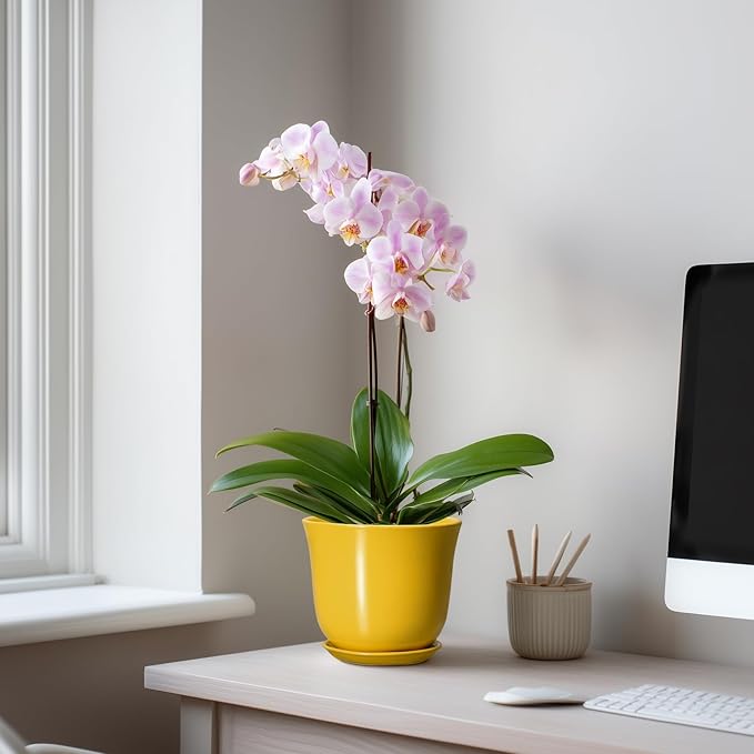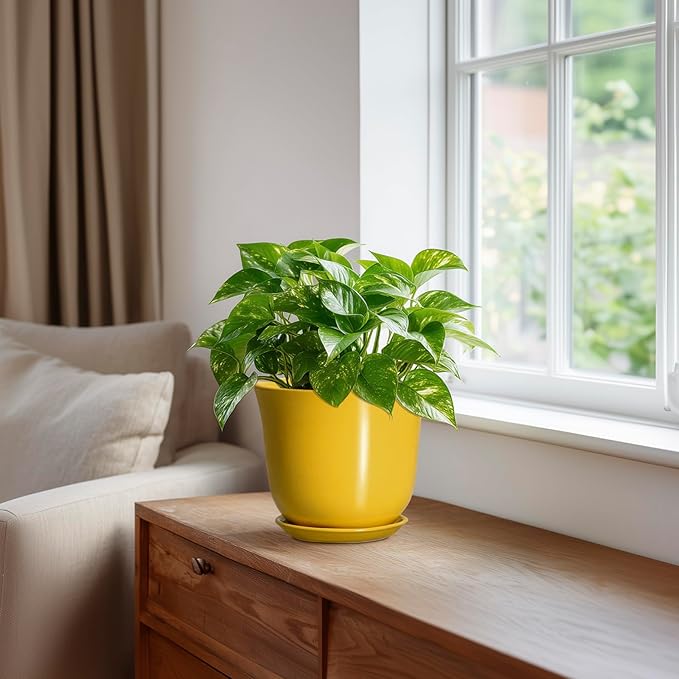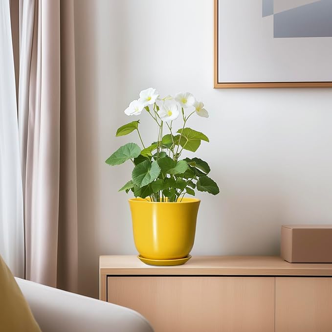 Ceramic Plant Pots - 5.6 Inch Planter with Drainage Hole and Saucer, Round Small Plant Pot for Indoor Outdoor, Modern Flower Succulent Orchid Pot, Desk Decor, Plant Lover Gifts, Yellow