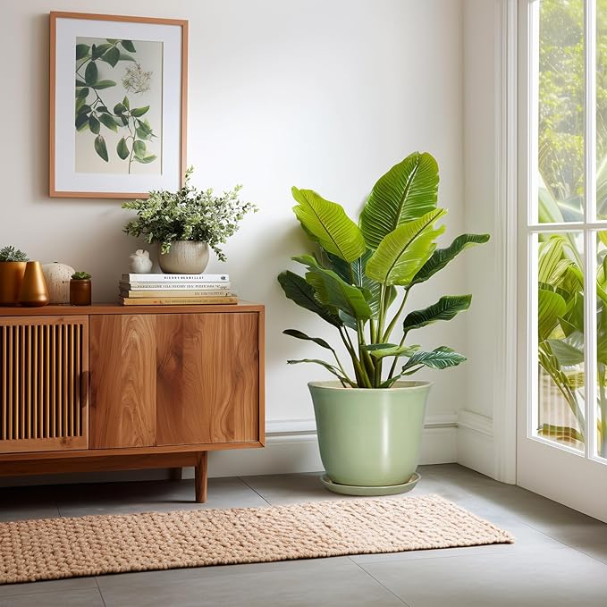 Ceramic Planter - 12 Inch Plant Pot for Indoor Outdoor, Round Planter with Drainage Hole and Saucer, Large Plant Pot, Modern Flower Pots, Home Garden Apartment Decor, Gardening Gifts, Green