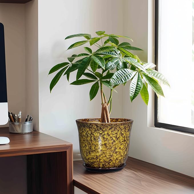 Ceramic Planter - 8 Inch Plant Pot for Indoor Outdoor, Round Flower Pots with Drainage Hole and Saucer, Modern Planter, Decorative Plant Pots, Home Office Decor, Gardening Gifts, Yellow