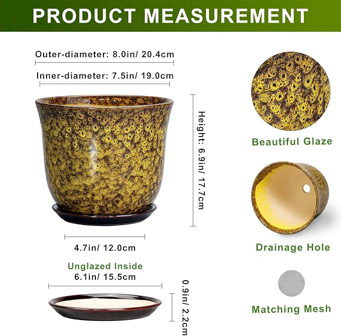 - Ideal Size: This ceramics pots for plants measures 8.0" x 8.0" x 6.9" and comes with drainage holes, a plant saucer, a drainage net, creating a healthier environment for plants while keeping your space neat and clean