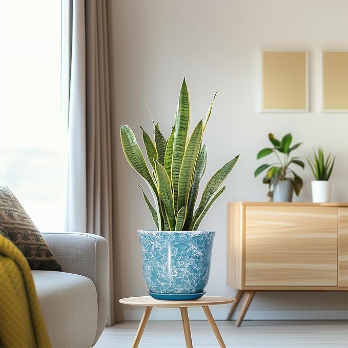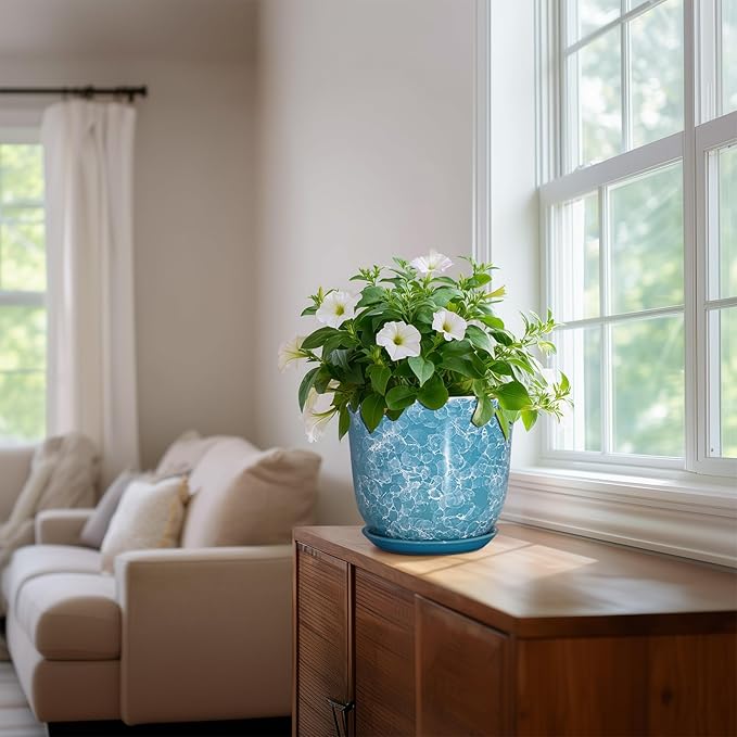 8 Inch Plant Pot - Ceramic Planter with Drainage Hole and Saucer, Round Planter for Indoor Outdoor, Modern Planter, Decorative Flower Pot, Apartment Garden Home Decor, Gardening Gifts, Blue